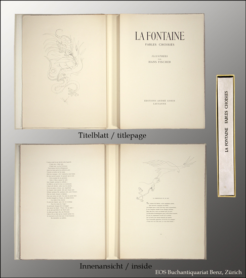 La Fontaine, Jean de.  Fables choisies. Illustrées par Hans Fischer. Lausanne, André Gonin, 1948 Gross-8°. 125 (4) S. Mit zahlreichen Illustr. nach Hans Fischer. Lose Bogen in brosch. Orig.-Umschlag, Halbpergament-Chemise u. Papp-Schuber = „Collection des Flambeaux“, (letzter) Bd. 10.