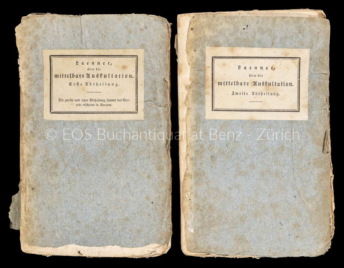 Laennec, René T. H.:  Die mittelbare Auskultation oder Abhandlung über die Diagnostik der Krankheiten der Lunge und des Herzens. Nach dem Franz. im Auszuge bearbeitet. Weimar, Verl. des Landes-Industrie-Comptoirs, 1822. 2 Bände. 618 S., (6) Bl. Mit 4 gef. Tafeln. Interims-Broschur der Zeit.