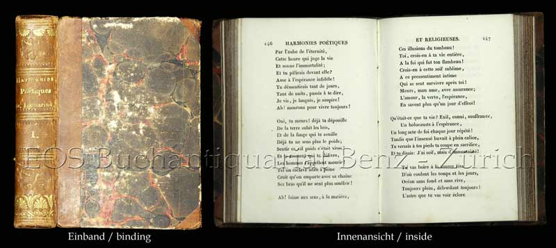 Lamartine, Alphonse de: Harmonies poétiques. Paris, Charles Gosselin, 1832. 5è. édition. 2 Bände. 12°. 287 S.; 296 S. Mit 2 gest. Titel. Halblederbände der Zeit mit Rückenvergoldung (berieben und bestossen).