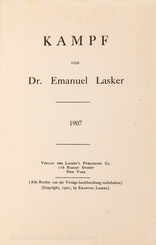 Lasker, Dr. Emanuel; Kampf. New York. Verlag des Lasker’s Publishing Co. 1907. 8″. 79 S. Geprägter Leinenband.