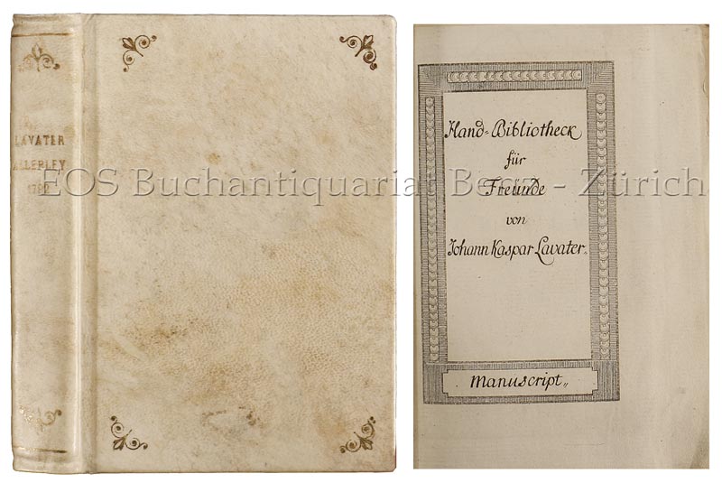 Lavater, Kaspar: Hand-Bibliotheck für Freünde von Johann Kaspar Lavater. Manuscript. O.O., o.Dr., (1772). 12°. Hs. Titell mit typographischem Rahmen, 363 S. Pergament über Karton, verg. Rückentitel, Goldfleurons auf Rücken und Deckeln, unbeschnitten.