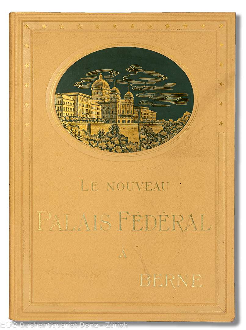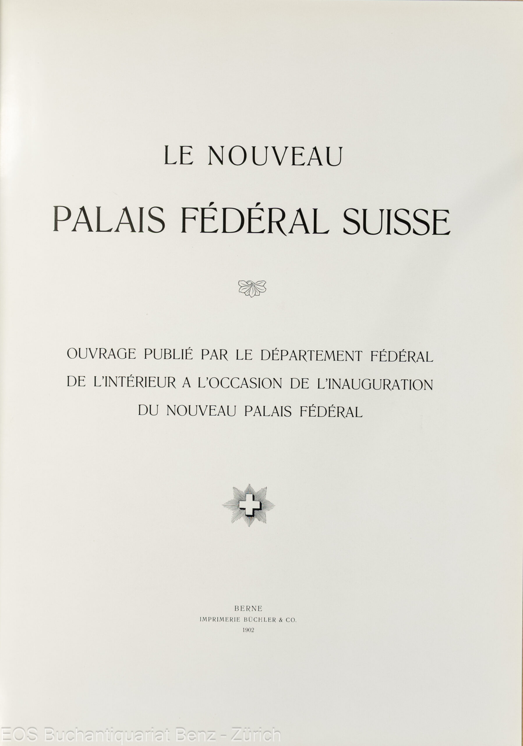 Le nouveau Palais Fédéral Suisse (à Berne). – Ouvrage publié par le Département fédéral de l’Intérieur à l’occasion de l’inauguration du nouveau Palais fédéral. Bern, Büchler, 1902. Folio. 102, (2) S. Mit vielen Textabb. Illustr. und gepr. Orig.-Leinenband.