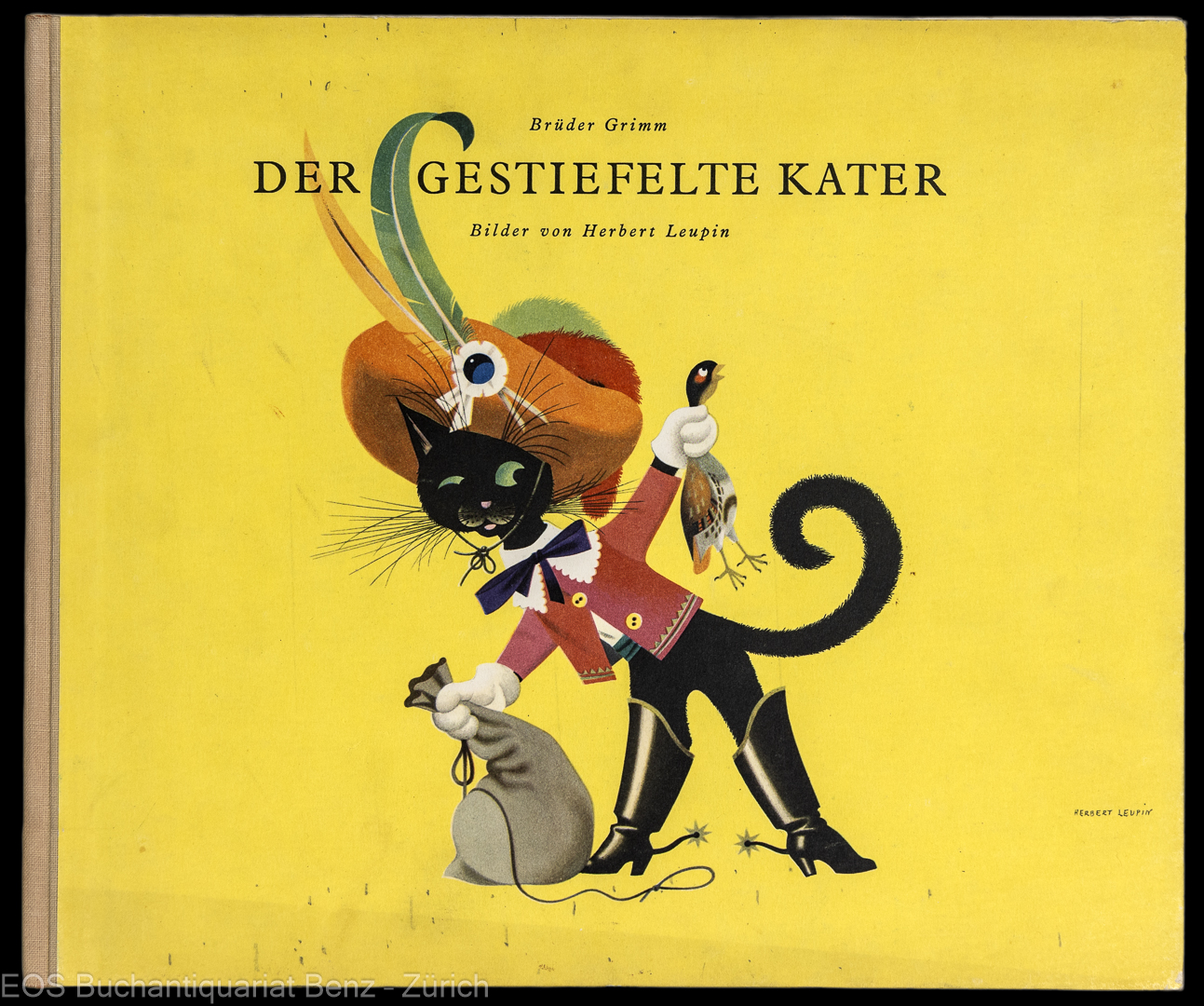 Märchen. – Leupin, Herbert (Gebr. Grimm): (Hrsg. J.K. Schiele) Der gestiefelte Kater. Zürich, Globi-Verlag, 1946. 1.-25. Tausend. Qu.-8°. 8 nn Bl. Farbige Illustr. von Herbert Leupin.. Illustr. Orig.-Hln.