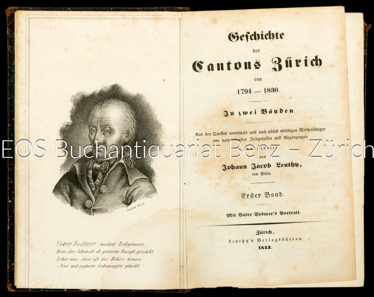 Leuthy, Johann Jakob: Geschichte des Cantons Zürich von (1794–1830. In zwei Bänden. Aus den Quellen untersucht und nach höchst wichtigen Mittheilungen von noch lebenden Zeitgenossen und Augenzeugen dargestellt. Zürich, Leuthy’s Verlags-Bureau, 1843. 2 in 1 Band. 8°. (2) Bl.,546 S., (1) Bl.; (1) Bl., 258 S., (1) Bl. Mit 3 lithogr. Portraits. Halblederband mit vergoldetem Rückentitel.
