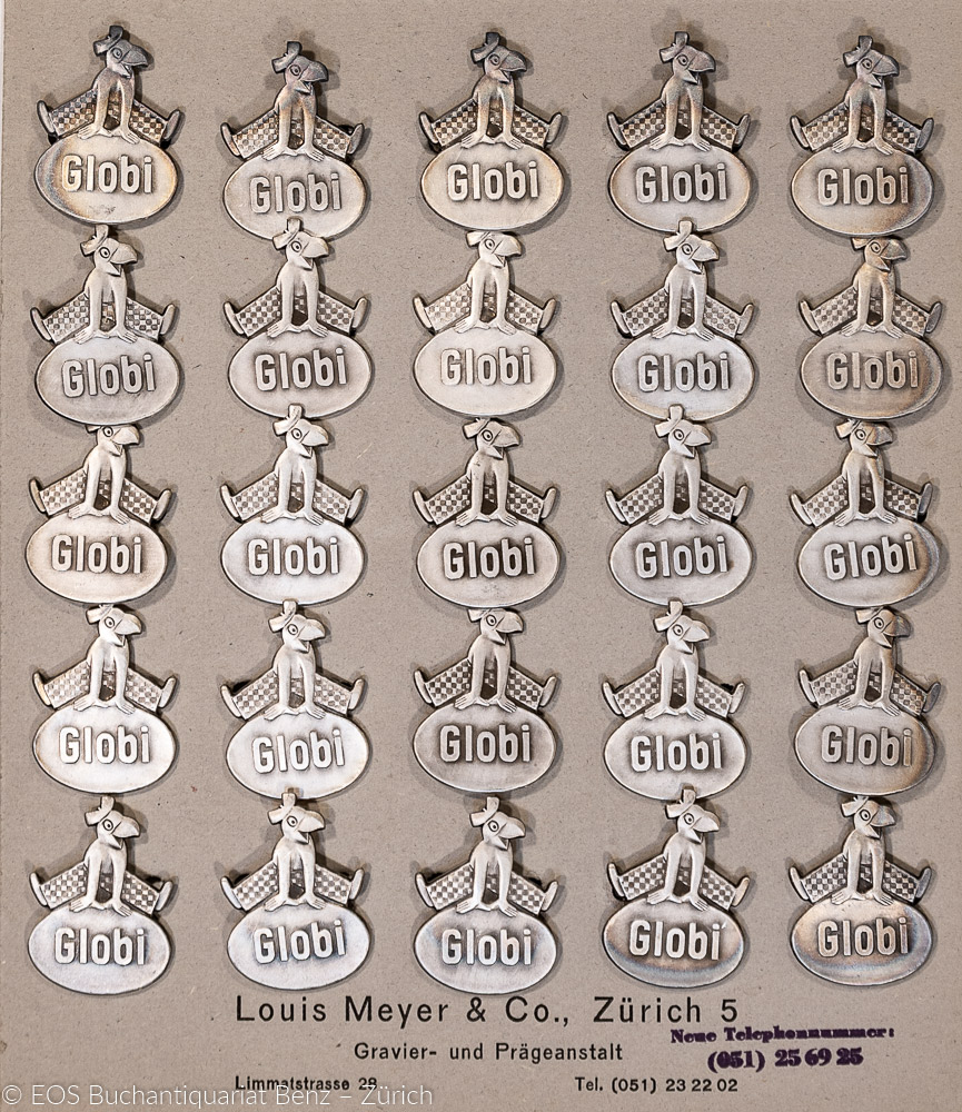 Lips, Robert: 20 Jahre Globi – Kompletter Bogen mit 25 Pins mit Anstecknadel oder Öse aus Metall 3,5 x 2,5 cm. Zürich, 1952.