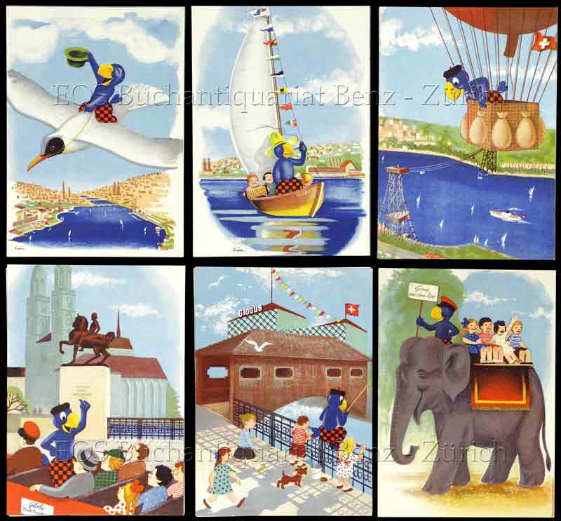 Lips, Robert: 6 bunte Globi-Postkarten. Erinnerung an die Landes-Ausstellung. Zürich, (um 1940). In Orig.-Umschlag.