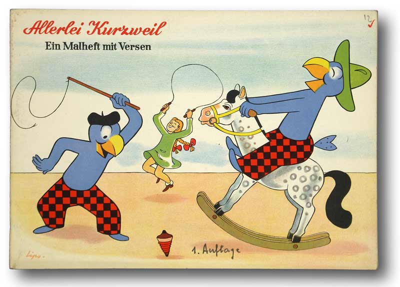 Lips, Robert: Allerlei Kurzweil. Ein Malheft mit Versen. (Zürich, Globi-Verlag, 1950 – 1972 1., 2., 3., 4. oder 5. Auflage. Quer-8°. (12) Bl. Mit 6 farbigen Vorlagen und 6 schwarz-weissen Illustrationen von Robert Lips. Farbig illustrierter Orig.-Umschlag mit Klammerheftung.