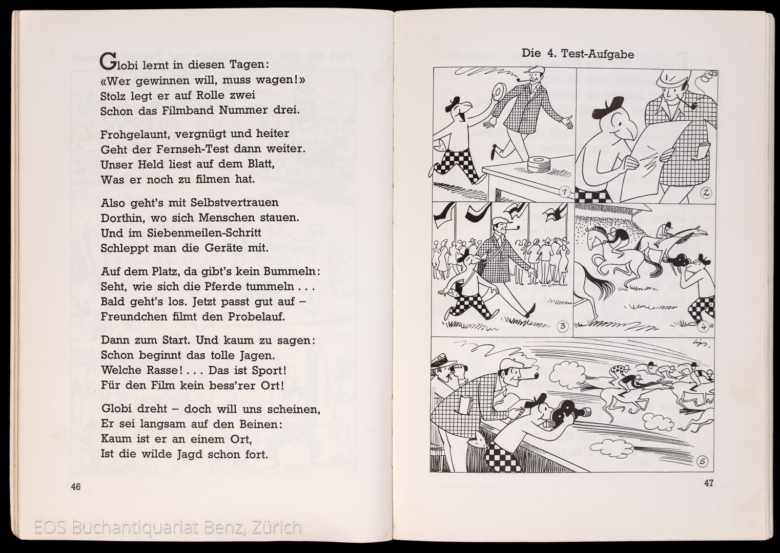Lips, Robert: Globi beim Fernsehen. Zürich, Globi-Verlag, 1961. 1. Auflage. Gr.-8°. 99 S., (1) S. (Verlagsanzeigen). Mit Bildgeschichten von Robert Lips. Farbig illustrierter Orig.-Halbleinenband.