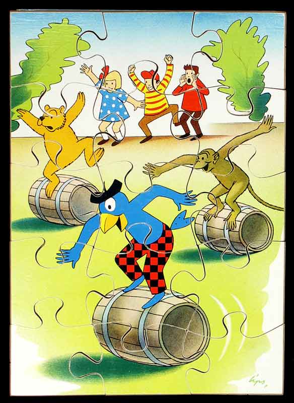 Lips, Robert  Globi-Puzzle (15 Teile). Illustration aus „Globi und Robi und ihr seltsamer Zoo“. Zürich, 1966. Farb. Druck auf Holz 24 x 17 cm.