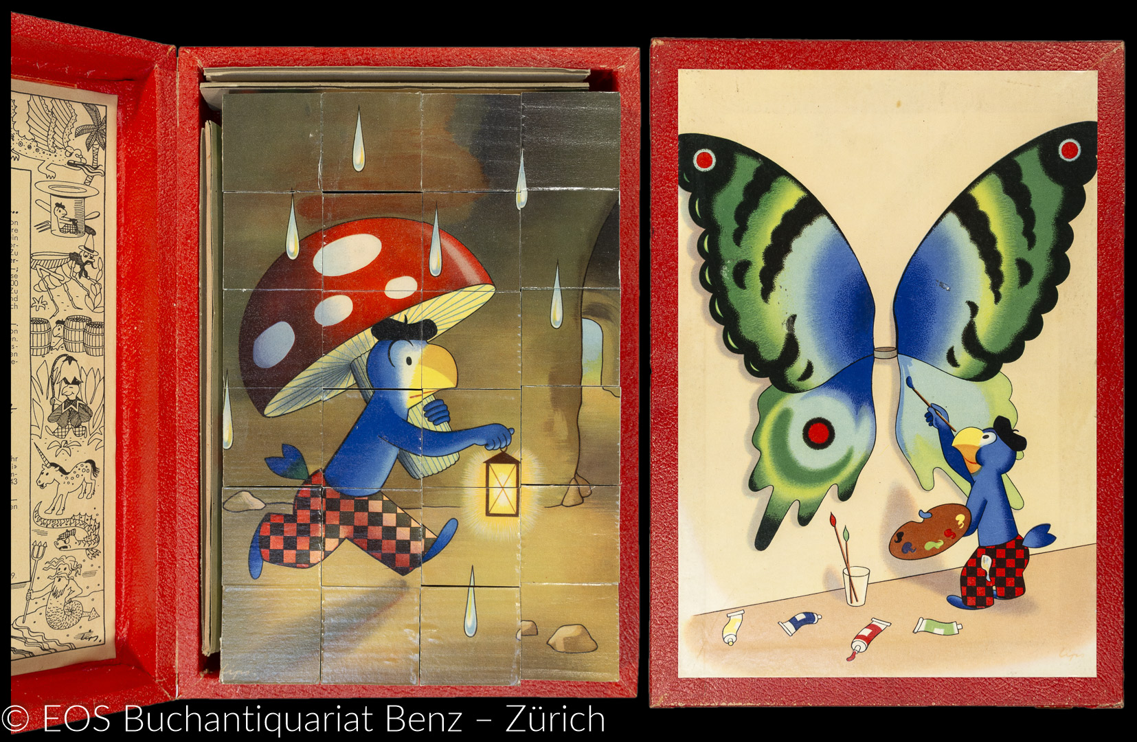 Lips, Robert: Kubusspiel aus Holz 24-teilig mit 6 montierten farb. Motiven aus dem Globibuch „Globi im Märchenreich“ (25 x 16 cm). Zürich, 1942.