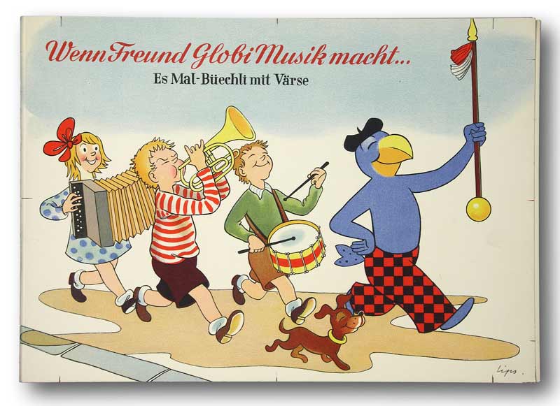 Lips, Robert: Wenn Freund Globi Musik macht… Es Mal-Büechli mit Värse. (Zürich, Globi-Verlag, 1946 – 1968. 1. oder 2. Auflage. Quer-8°. (12) Bl. Mit 6 farbigen Vorlagen und 6 schwarz-weissen Illustrationen von Robert Lips. Farbig illustrierter Orig.-Umschlag mit Klammerheftung.