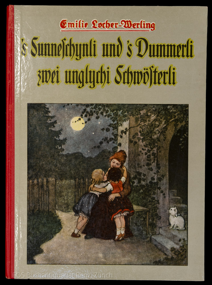 Locher-Werling, Emilie: S’Sunneschynli und s’Dummerli zwei unglychi Schwösterli. Zürich, Waldmann, o.J. (um 1925). 4°. (32) S. Mit zahlr. farb. Illustr. von Franziska Schenkel. Farb. illustr. Original Halbleinenband.