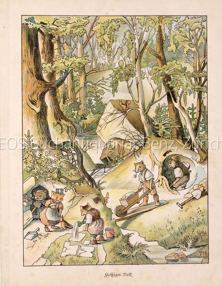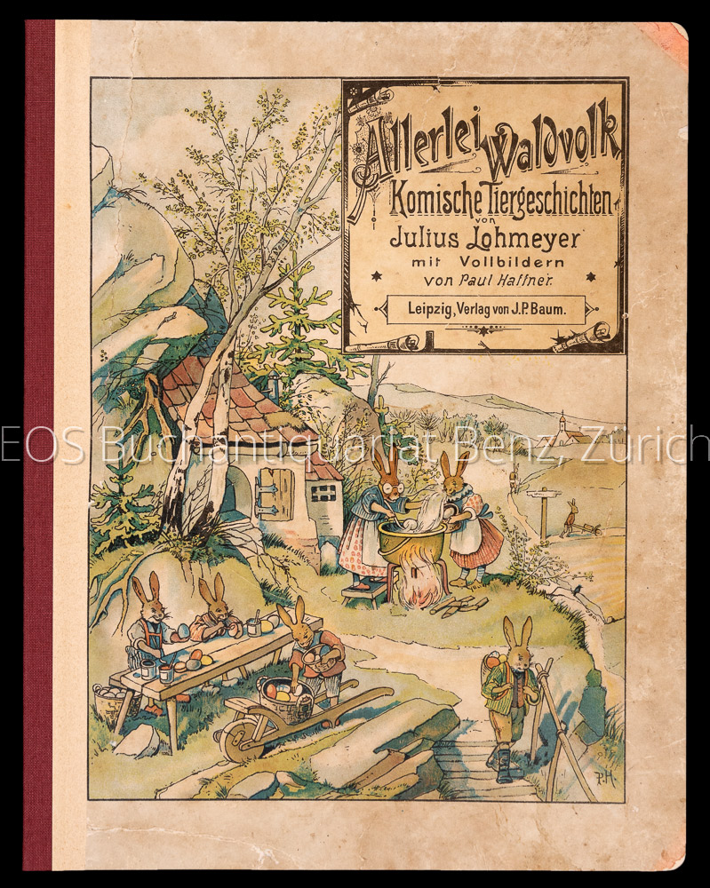 Lohmeyer, Julius: Allerlei Waldvolk. Komische Tiergeschichten. Leipzig, Baum, (1897). 4°. 12 Pappseiten. Mit lithogr. Titel und 6 ganzseitige Farblithographien von Paul Haffner. Neuer Leinenband mit illustrierten Pappdeckeln.