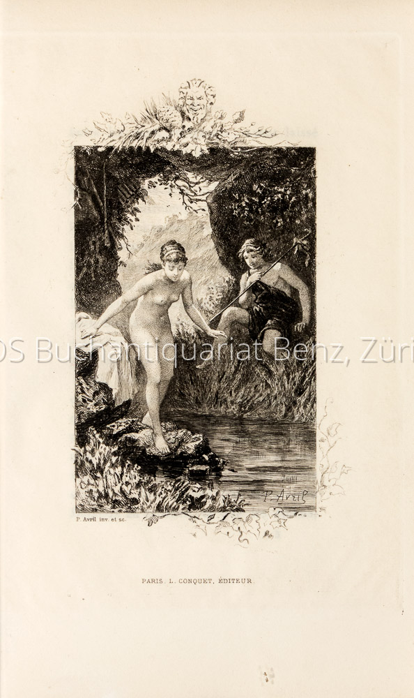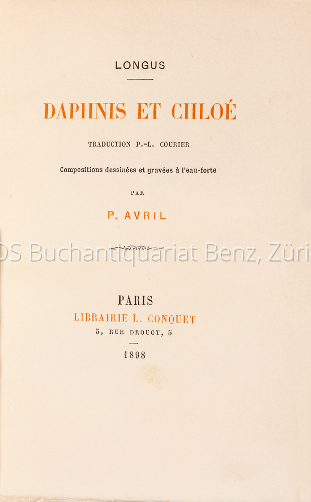 Longus:  Daphnis et Chloé. Traduction P.-L. Courrier. Paris, Librairie L. Conquet, 1898. 8°. (2) Bl., 219 S., (2) Bl. Mit 1 Frontisp., 4 Anfangsvignetten, 4 Schlussvignetten und 4 Radierungen auf Tafeln von Paul Avril. Halblederband der Zeit.