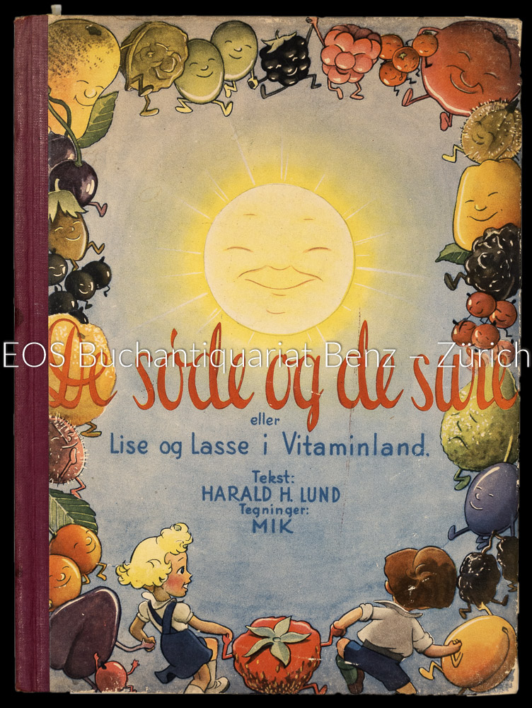 Lund, Harald H.: De sóde og de sure eller Lise og Lasse i Vitaminland. Kopenhagen, Udgivet Paa Eget Forlag, 1942. 4°. (24) S. Mit farb. Illustrationen von Dahl Mikkelsen. Farb. illustr. Orig.-Halbleinenband mit Klammerheftung.