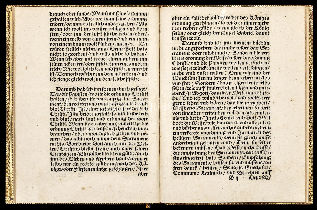 VD 16 L 4178 mit den Erkennungsmerkmalen auf Blatt AIIa, Zeile 19 «durch lesen/» und im Kolophon «Gedruck …» . – Benzing 3093 (Variante B1). – Claus/Clegg, Ergänzungen, 3093. – Henning, Verzeichnis der Luther-Drucke, 846. – Cf. Stuttgarter Antiquariat Kocher-Benzing, Gilhofer und Hans Horst Koch, Kat. Martin Luther (1972), Nr. 292. – Das Werk trägt die Widmung «Dem gestrengen und Vesten N. meinem besondern herrn und gunstigen freunde». Die Schrift beieht sich auf Reaktionen, welche Luthers 1533 erschienenes Werk «Von der Winkelmesse …» ausgelöst hatte. «Die Gegner Luthers, insbesondere Fürst Johann von Anhalt, hatten Luther … verdächtigt, sich den Sakramentieren und Schwärmern um Zwingli zu nähern. (Er) bezieht … hier eindeutig Stellung und legt nochmals den Unterschied zwischen der ‹Messe› und dem ‹Sakrament› dar.» (Kocher-Benzing). – Die schöne Titeleinfassung zeigt den guten Hirten und weist in Medaillons die Initialen von Martin Luther, Philipp Melanchthon, Justus Jonas, Caspar Cruciger und Johannes Bugenhagen auf. Sie wurde einst als ein Werk Cranachs angesehen, dann auch Georg Lemberger (um 1495 – um 1540), der für Lufft arbeitete, zugeschrieben, wie ein hs. Eintrag eines Vorbesitzers nahe legt. Kocher-Benzing nennt H. Zimmermann (Buchillustr. S. 72), der ihn dem Monogrammisten MS, dem Illustrator der ersten Lutherbibel von 1524, zuschreibt. – Oberer Rand etwas knapp beschnitten, sonst sehr gutes Exemplar. (Sprache: Deutsch / German)