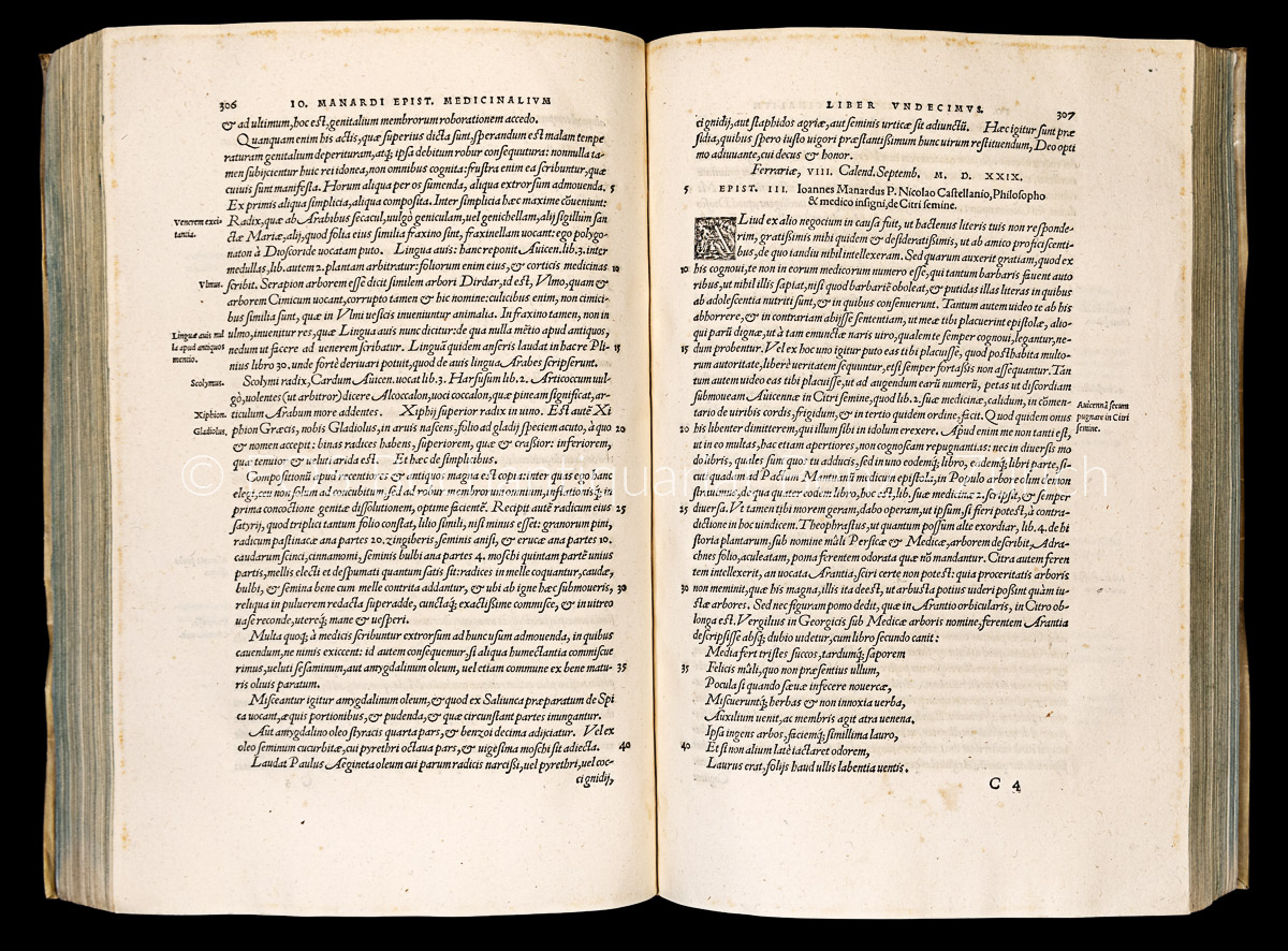 BM, Germann Books 590. – Durling 2915. – Waller 6208. – Hirsch-H. IV, 50. – HOH 155 (für Ausgabe Basel 1535). – Dritte Basler Ausgabe der Epistola. Wunderschöner, grosszügiger Kursivdruck. Giovanni Manardi (1462–1536) studierte in Ferrara, wo er als Professor Nachfolger von Leoniceno wurde. Einer der gelehrtesten Ärzte seiner Zeit, der sich aber auch einen Namen machte als Krititker der Astrologie. Die erste Ausabe des Werkes erschien bereits 1521, das Buch wurde jedoch für die Basler Ausgaben von 6 auf 18 und in der vorliegenden Fassung auf 20 Bücher erweitert. «The letters illustrate in an intresting way the transition form Arabian to Greek dominion. The opinions of Avicenna, Hippocrates and Galen are quoted on every page» (Osler). Beschreibt unter anderm die Syphilis von der er überzeugt ist, dass sie von spanischen Matrosen aus Amerika «Ex insula quadam antiqua incognito» eingeschleppt wurden. – Exlibris des Fürsten von Liechtenstein auf dem Innendeckel. Mit vereinzelten kleinen Stockflecken. – Sehr schönes Exemplar. (Sprache: Lateinisch / Latin)