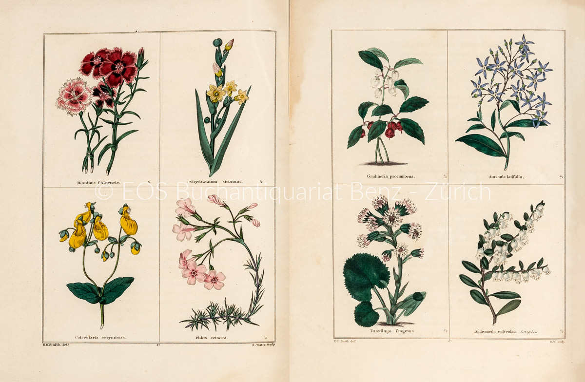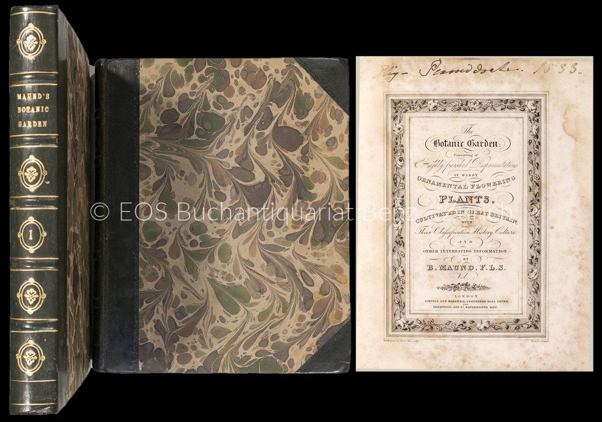 Nissen 2222. – Erstausgabe der ersten zwei Bände eines auf 13 Bände angelegten Werkes, das zwischen 1825 bis 1851 (?) erschien, herausgegeben von dem Apotheker und Buchhändler Benjamin Maund (1790-1864). Die Beschreibungen der akkurat gezeichneten und sorgfältig kolorierten Pflanzen enthalten Angaben wie lateinische und englische Namen, Klasse und Ordnung, Herkunftsland, Blütezeit usw. Als Künstler nennt Nissen Mrs. E. Bury, Miss Eliza Maund, Miss S. Maund, Mills und E.D. Smith, deren Originalzeichnungen befinden sich im British Museum. – Zu Beginn etwas fleckig, alter Namenszug auf den gest. Titeln, sonst sauberes Exempalr.