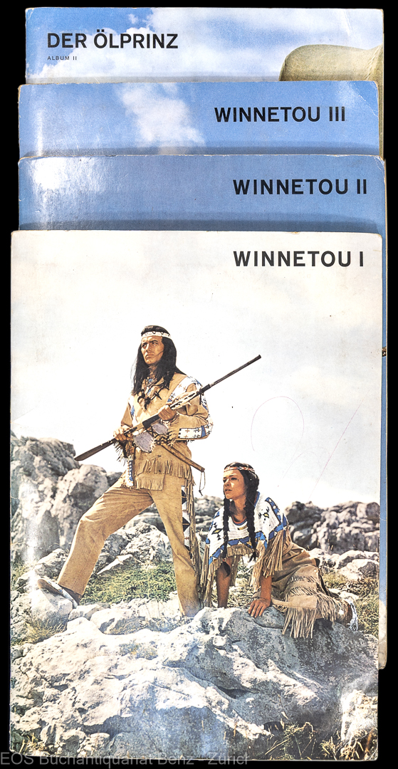 Zigarettenalbum. (May, Karl:)  Winnetou I, II, III und der Ölprinz. Belp-Bern, Eikon Vlg. 1970. 4 Bände. 4°. Je 16 S. Mit zahlreichen farb., mont. Abb. aus dem gleichnamigen Film. Farbige Orig.-Hefte.