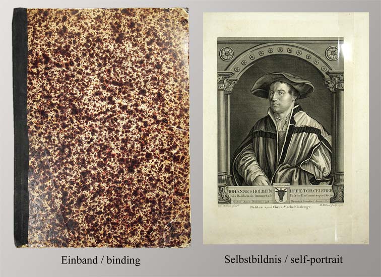 Thieme/Becker 17/18, 355 sowie Thieme-Becker 18, 44 (für Hübner). – 3. Band des 4-teiligen Werkes über das Oeuvre von Hans Holbein in späterer Auflage. Es erschien erstmals 1780/92 unter dem franz. Originaltitel „Oeuvre de Jean Holbein ou Recueil de gravures d’après les plus beaux ouvrages de ce fameux peintre / publ. par Chrétien de Mechel“. Die Portraits zeigen u.a. Holbeins Familie, Jakob Meier, Anna Scheckenpürlin, Bonifazius Amerbach, Johannes Frobenius u. Thomas Morus. – Vollständigkeit der Tafeln durch uns nicht nachweisbar. Es fehlt das Titelblatt. Vorderes Innengelenk gebrochen. Durchgehend nur wenig stockfleckig. (Sprache: Französisch / Français / French)