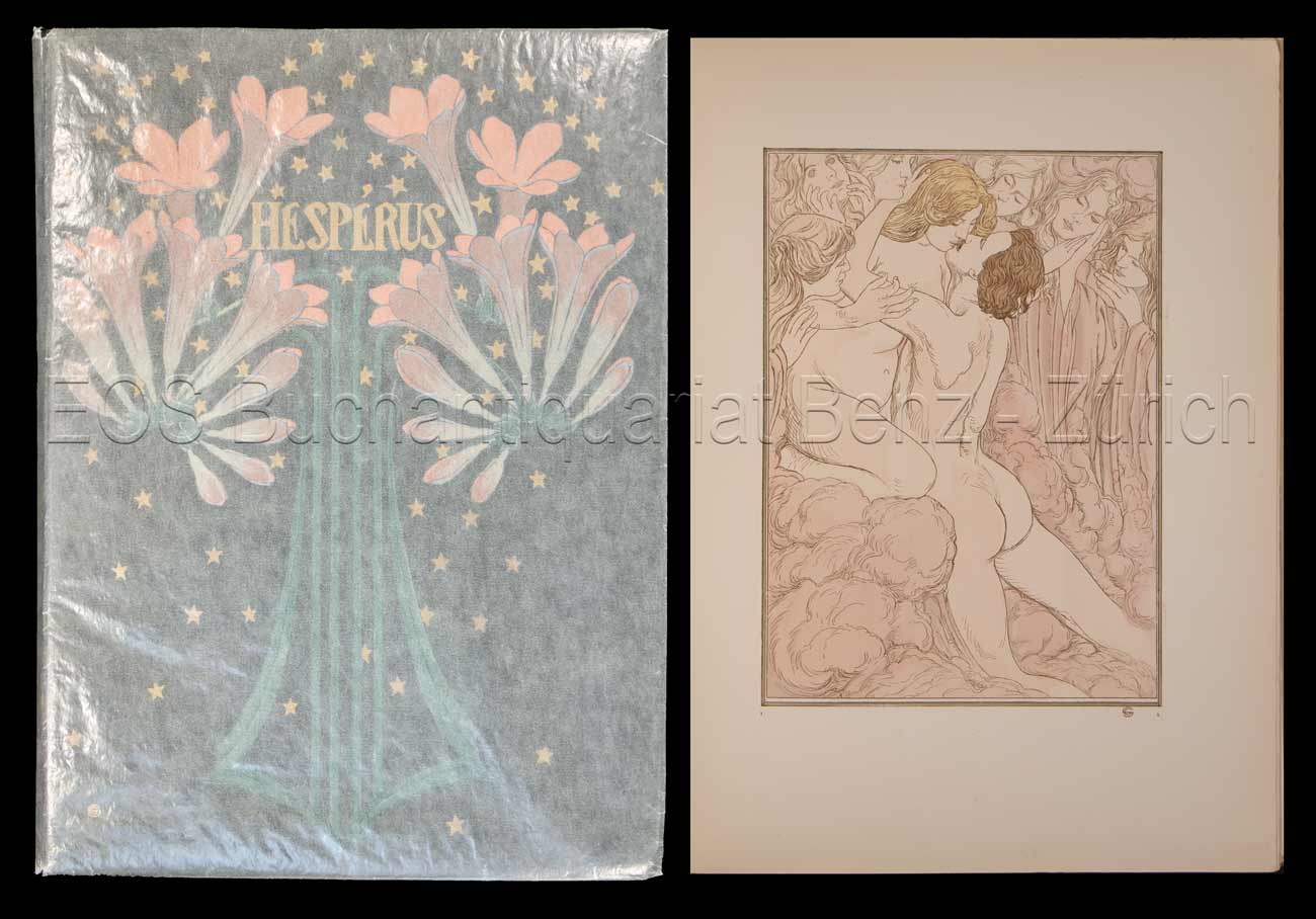 Mendès, Catulle: Hespérus. Paris, Société de propagation des livres d’art, 1904. 4°. 96 S., (2) Bl. Mit 13 farb. Tafeln und reicher Buchschmuck von Carloz Schwabe. Farb. illustr. Orig.-Broschur mit Pergamin-Schutzumschlag.