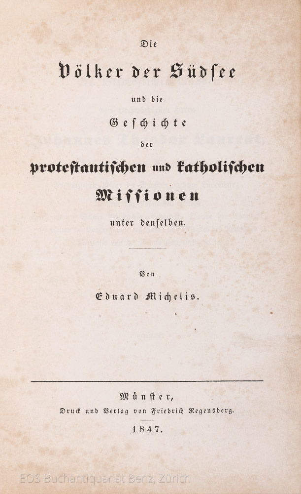 Michelis, Eduard: Die Völker der Südsee und die Geschichte der protestantischen und katholischen Missionen unter denselben. Münster, Verlag Friedrich Regensberg, 1847. 8°. 539 S. Moderner Halbleinenband.
