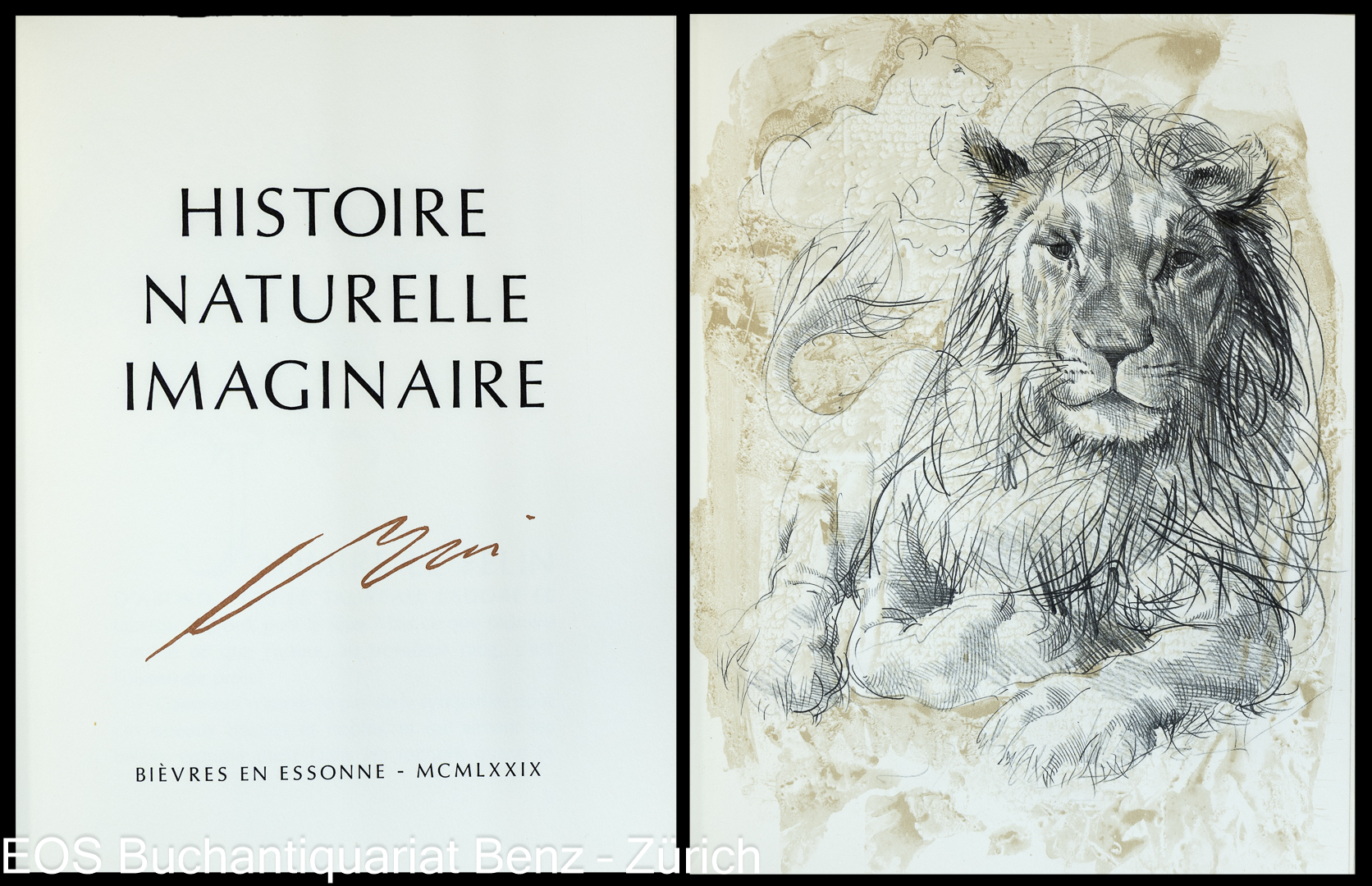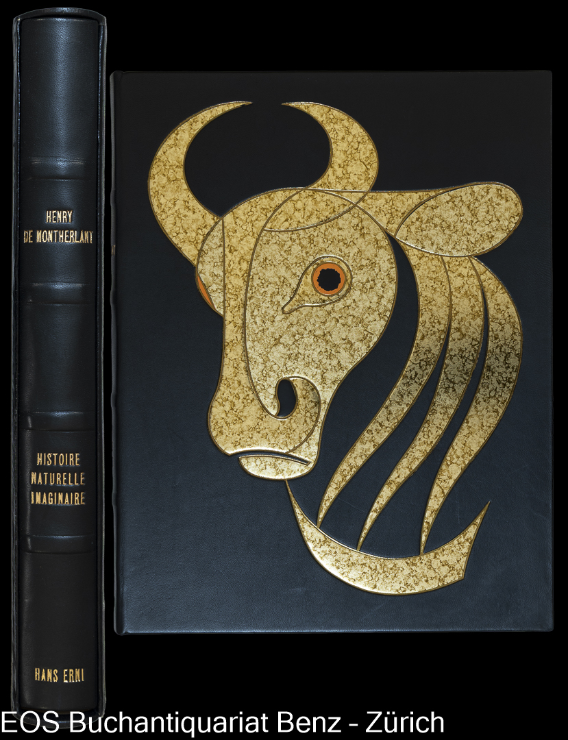 Montherlant, Henry de: Histoire naturelle imaginaire. Bièvres en Essonne, Centre artistique et culturel du Moulin de Vauboyen, 1979. 4°. 145 S., mit 37 Lithografien von Hans Erni. Zusätzliche Suite von 4 Lithografien. Schwarzer Orig. Kalbslederband mit von Erni gestalteter Deckelillustration im Orig. Schuber.