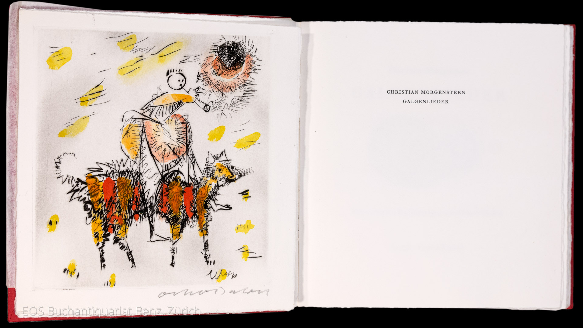 Morgenstern, Christian: Galgenlieder. Zürich, Arcade-Presse, 1968. 8°. 70, (4) S. Mit kol. Radierung, einer radierten Titelvignette und 13 ganzs. Radierungen von Oskar Dalvit (signiert). Halbpergamentband.