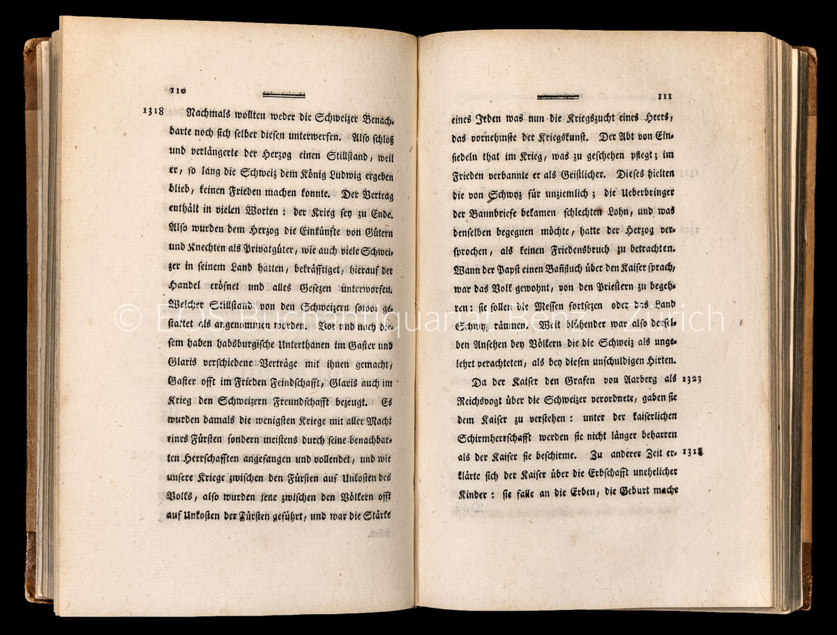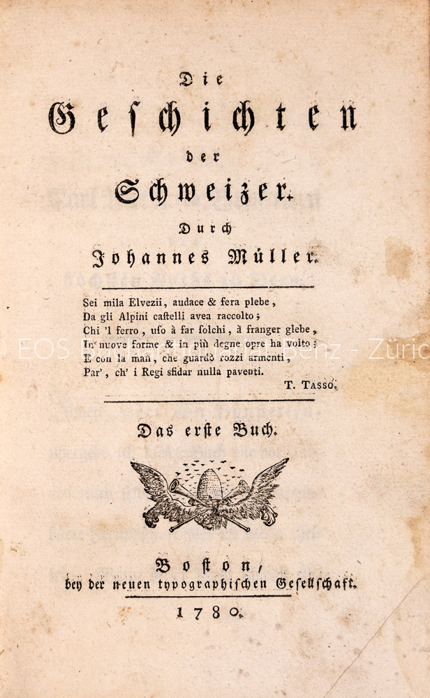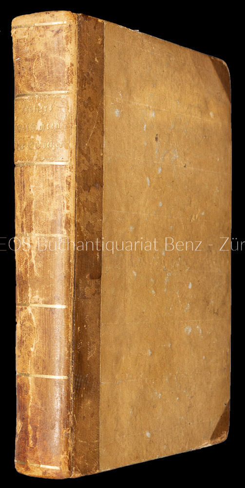 Feller/Bonjour 551. – Der erste Druck von Johannes Müllers (1752–1809) Jugendwerk, wobei ihn sein langjähriger Freund Karl Viktor von Bonstetten (1745–1832) unterstützte die Geschichte der Schweiz von den Anfängen bis 1388 zu publizieren. «Müller verarbeitete darin ein gewaltiges Material, wie es noch kein Historiker zusammengetragen hatte, Chroniken und Urkunden» (Feller/Bonjour). – Papier zum Teil wasserrandig. Die Vorsätze leimschattig. Mit altem handschr. Besitzereintrag. Der Einband berieben und bestossen. (Sprache: Deutsch / German)