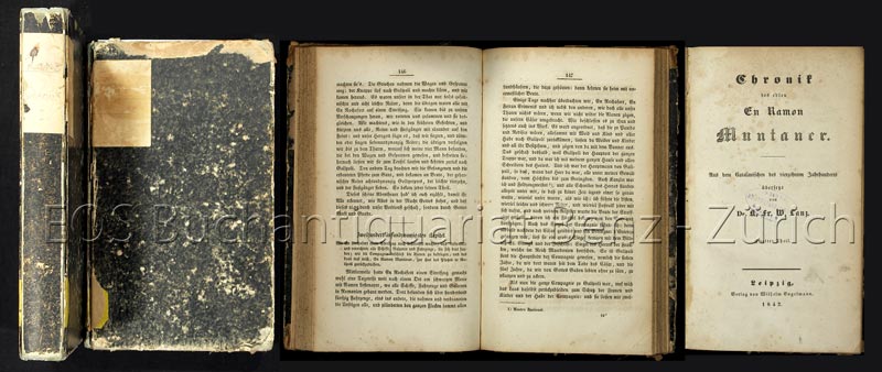 Muntaner, Ramon: Chronik des edlen En Ramon Muntaner. Aus dem Catalanischen des vierzehnten Jahrhunderts übersetzt von K. Fr. W. Lanz. Leipzig, (Breitkopf & Härtel für) Willhelm Engelmann, 1842. 2 Bde. 8°. XXIV, 322 S.; X, 325 S., 1 gef Stammtafel, 1 Bl. Errata. Pappbde. der Zeit.