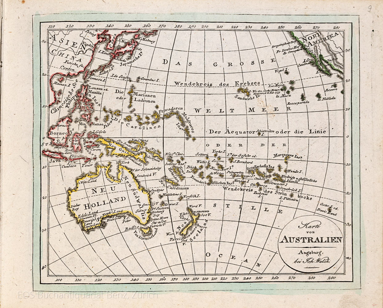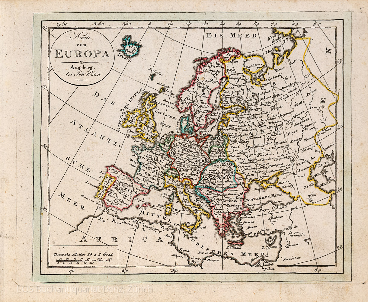 Neuester Schul-Atlas. Nach den bewährtesten Hülfsmitteln, astronomischen Ortsbestimmungen und den neuesten Zeitereignissen entworfen. Augsburg, Joh. Walch, 1820. Quer-8°. Mit gestochenem Titel und 35 grenzkolorierten Kupferstichkarten. Pappband der Zeit mit Kleisterpapierbezug.