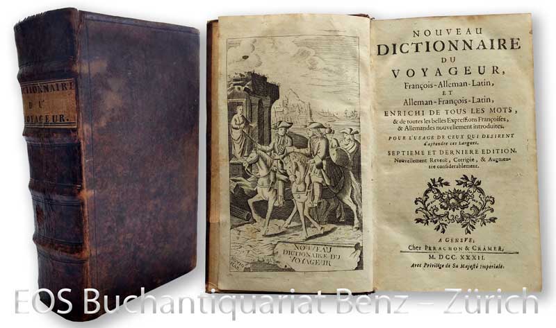 Nouveau dictionnaire du voyageur, françois-alleman-latin, et alleman-françois-latin, enrichi de tous les mots, &de toutes les belles expressions françoises & allemandes nouvellement introduites… Genève, Perachon & Cramer, 1732. (3) Bl., 1032 S.; 496 S. Mit gest. Frontisp. Lederband der Zeit.