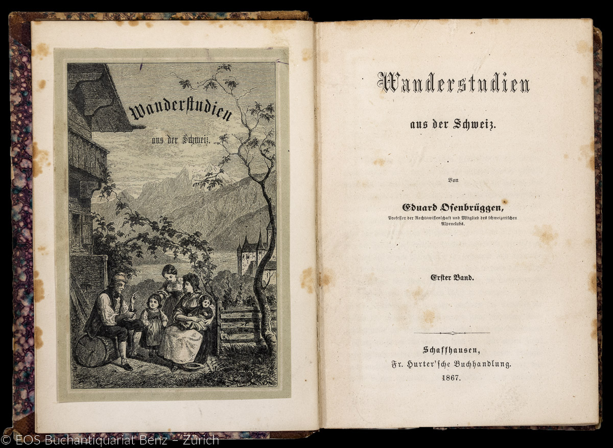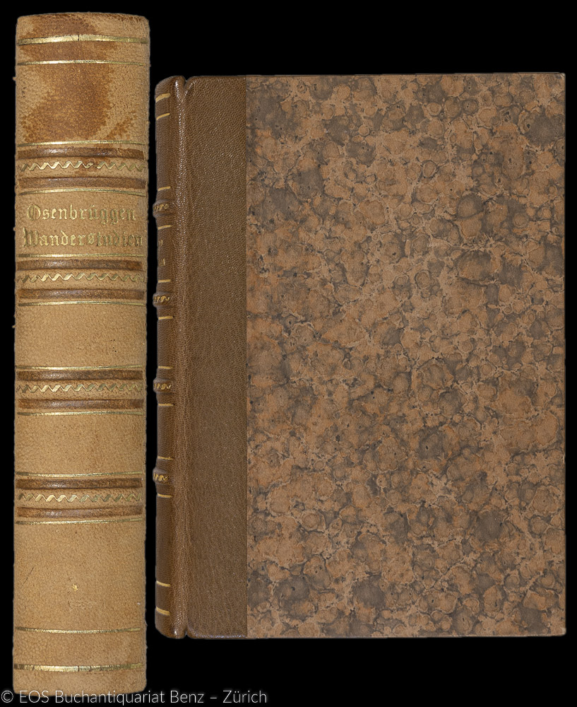 Osenbrüggen, Eduard: Wanderstudien aus der Schweiz. Schaffhausen, Hurter, 1867–1874. 4 (von 6) in 2 Bänden. 8°. IV, 365 S.; IV, 307 S.; IV, 334 S.; IV, 331 S. Halblederbände mit Rückenvergoldung.