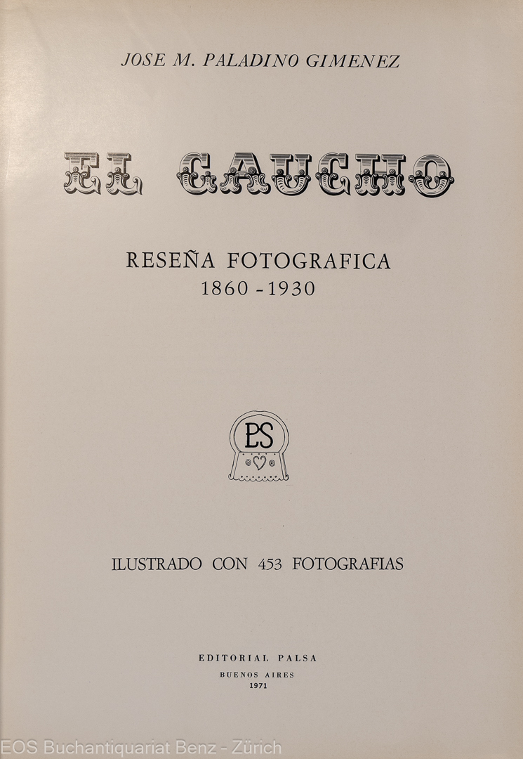 Paladino Gimenez, José M.: El gaucho. Reseña fotográfica 1860–1930. Buenos Aires, Ed. Palsa, 1971. 665 pages with 453 black/white photographs. Cloth binding.