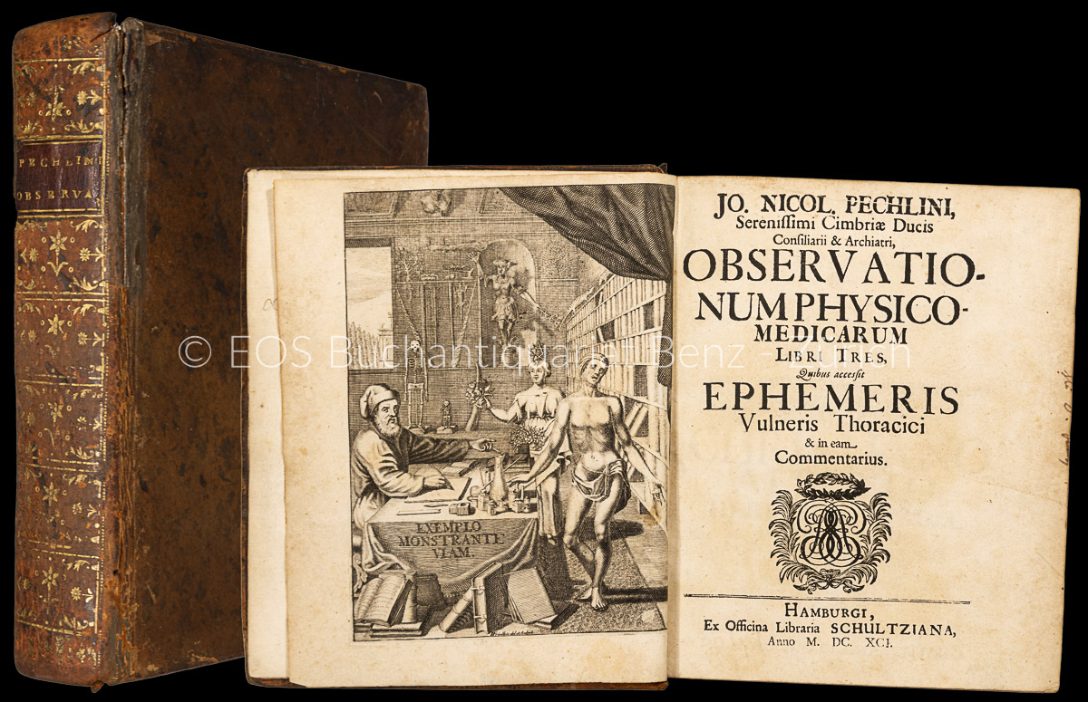 Pechlin, Johannes Nicolas: Observationum physico-medicarum. Libri tres, quibus accessit ephemeris vulneris thoracici & in eam commentarius. Hamburg, Schultze, 1691. 4°. (12) Bl., 545 S. 68 S. 1 Bl. (Errata). Mit gestochenem Frontispiz und 3 (von 6) gefalteten, gestochenen Tafeln. Lederband aus der Zeit mit goldgeprägtem Rückenschild und floraler Rückenvergoldung.