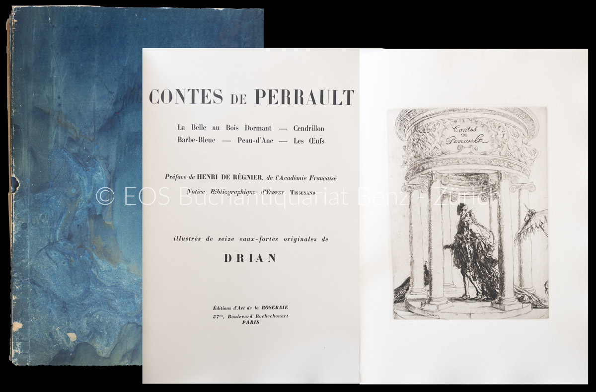 Perrault, Charles: Contes de Perrault. La Belle au Bois Dormant – Cendrillon – Barbe-Bleue – Peau-d’Ane – Les Oeufs. Préface de Hernri Régnier. Notice Bibliographique d’Ernest Tisserand. Paris, Roseraie, 1922. Gr.-Folio. 67 (1) S., V (1) S., (2) Bl. Mit 12 Radierungen auf Tafeln und 5 Radierungen im Text von Drian. Französische Broschur mit Pergaminschutzumschlag in doppeltem Pappumschlag.