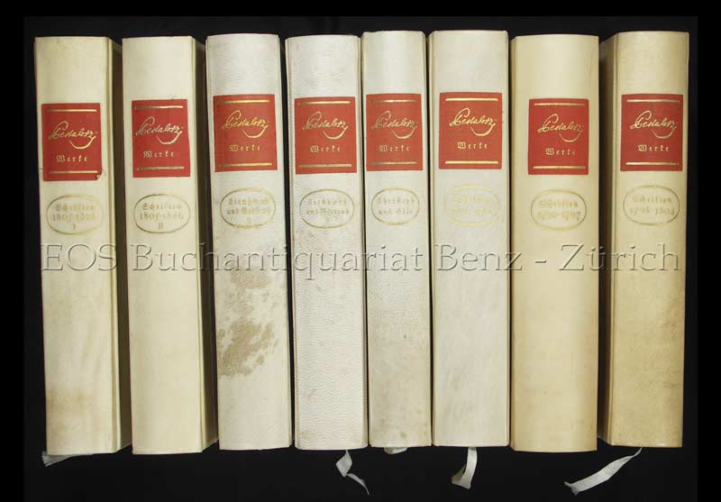 Wilpert/Gühring 1176. 30. – Bände I u. II: Lienhard und Gertrud. – Band III: Christoph und Else. – Band IV: Schriften aus den Jahren 1765-1783. – Band V: Schriften aus der Zeit von 1792-1797. – Band VI: Schriften aus den Jahren 1798-1804. – Band VII: Schriften aus den Jahren 1805-1826. – Band VIII: Schriften aus den Jahren 1805-1826. – Pergamentrücken zum Teil fleckig.