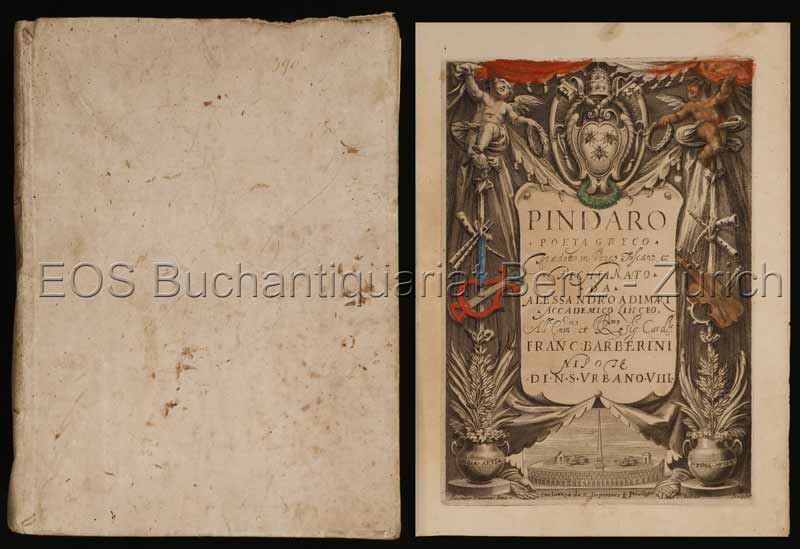 Pindar: Ode Di Pindaro Antichissimo Poeta. Cioè, Olimpie & Pithie & Nemee & Istmie Tradotte in Parafrasi, & in Rima Toscana Da Alessandro Adimari, e dichiarata dal medesimo. Con osseruazioni, e confronti d’alcuni luoghi immitati, ò tocchi Da Orazio Flacco. Pisa, Tanagli, 1631. 4°. (9) Bl., 748 S., (31) Bl. Mit 1 gest. (ankol.) Titel und 7 Kupfer im Text (davon 5 ganzs.). Flexibler Pergamentband der Zeit.