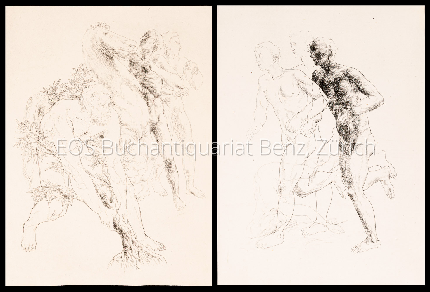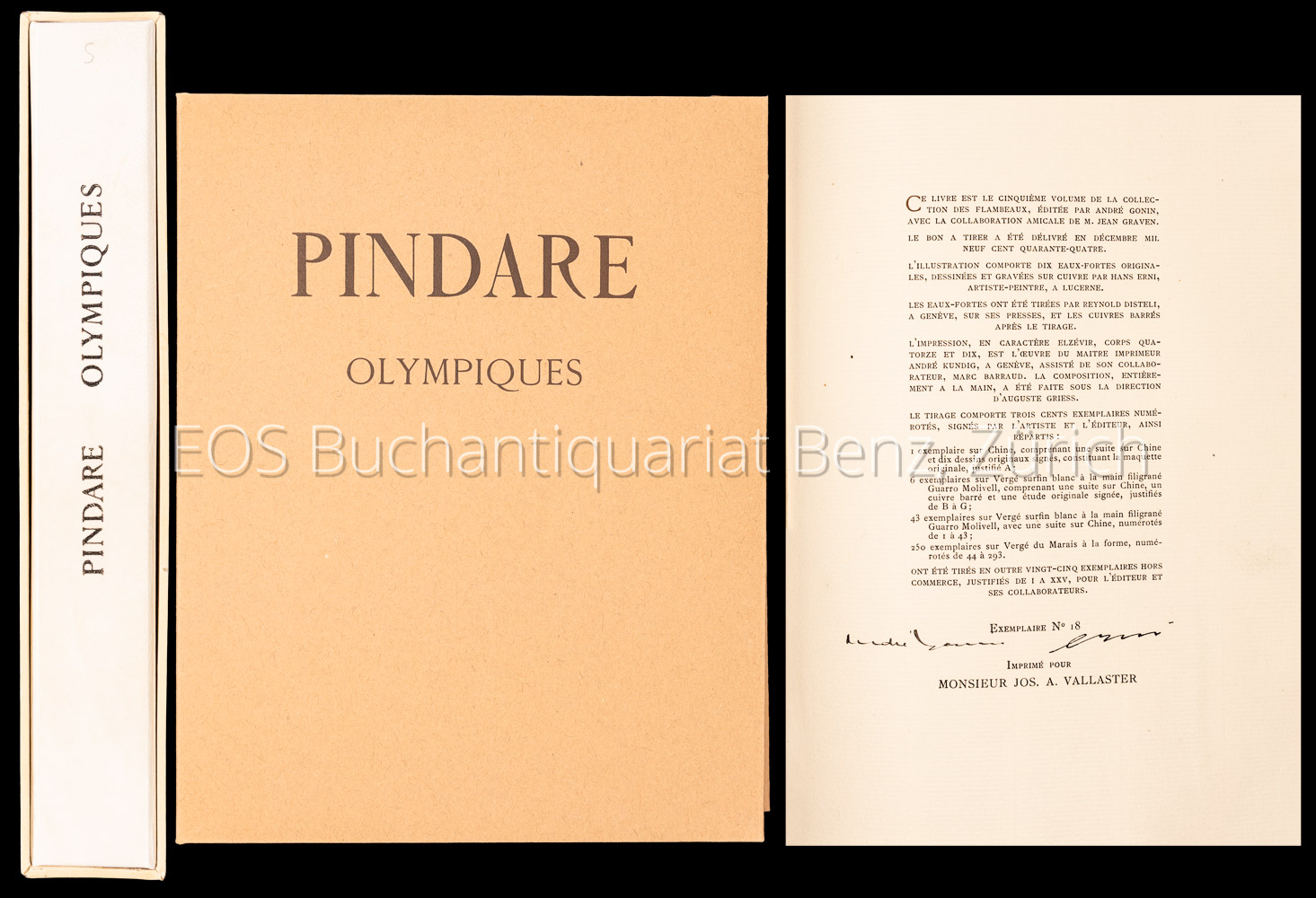 Pindare: Olympiques. Lausanne, André Gonin, 1944. 4°. 164 S, 6 Bl. 10 Radierungen von Hans Erni und der Suite von 10 zusätzlichen Radierung auf Chinapapier. Gefaltete Bogen in Halbpergament-Mappe und Schuber.