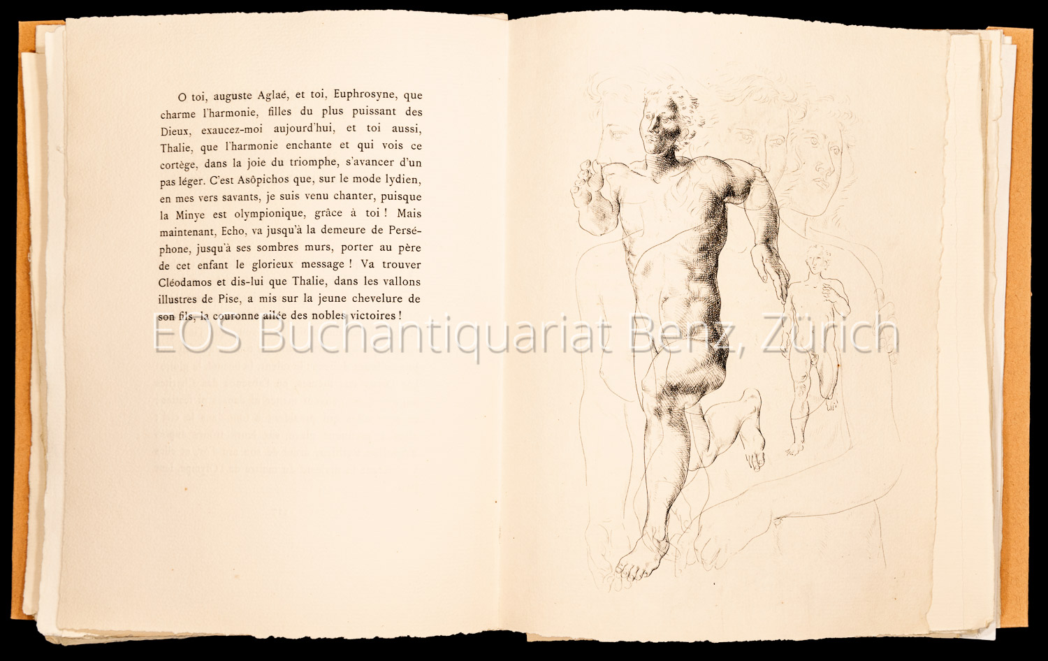 Ex. Nr. 18 von insgesamt 325 Exemplaren auf Vergé surfin blanc. Von Hans Erni und André Gonin (Herausgeber) signiert. „Cette Edition des Olympiques de Pindare a été réalisée pour le 50e anniversaire de la Renovation des Jeux Olympiques célébré a Lausanne du 17 VI au 3 VII MCMXLIV.“.