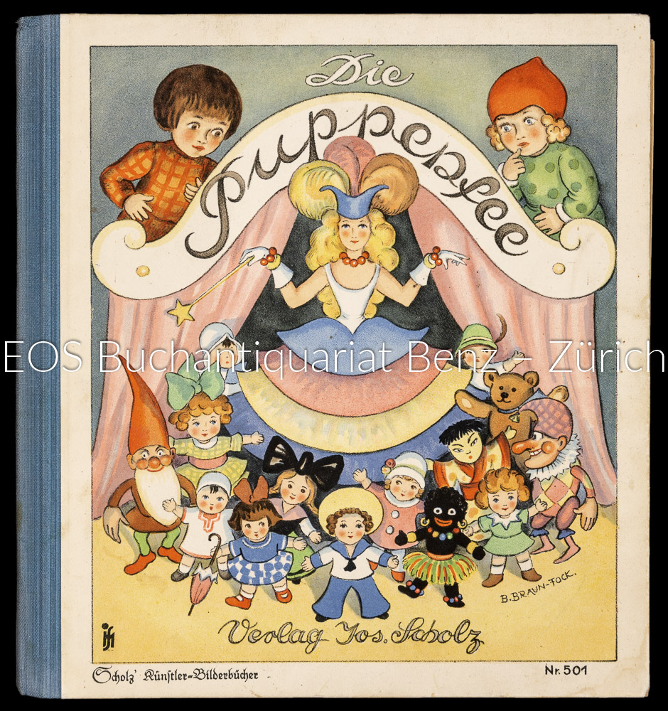 Probst, Hans: Die Puppenfee. Ein lustiges nächtliches Abenteuer bei den schönen Spielsachen. Mainz, Verlag Jos. Scholz, (1930). octavo. 24 nicht numerierte Seiten mit 12 ganzseitigen Illustratoen von Beatrice Braun-Fock. Scholz‘ Künstler-Bilderbücher, Nr 501.