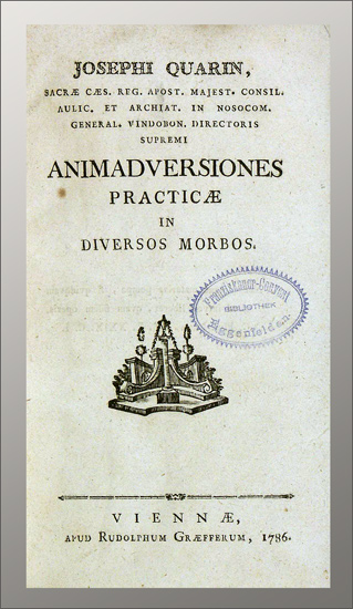 Quarin, Josef von: Animadverisones practicae in diversos morbos. Wien, Rudolf Graeffer, 1786. 8°. 6 n.n. Bl., 338 S. Halblederband der Zeit mit goldgeprägtem Rückentitel und Rückenvergoldung.