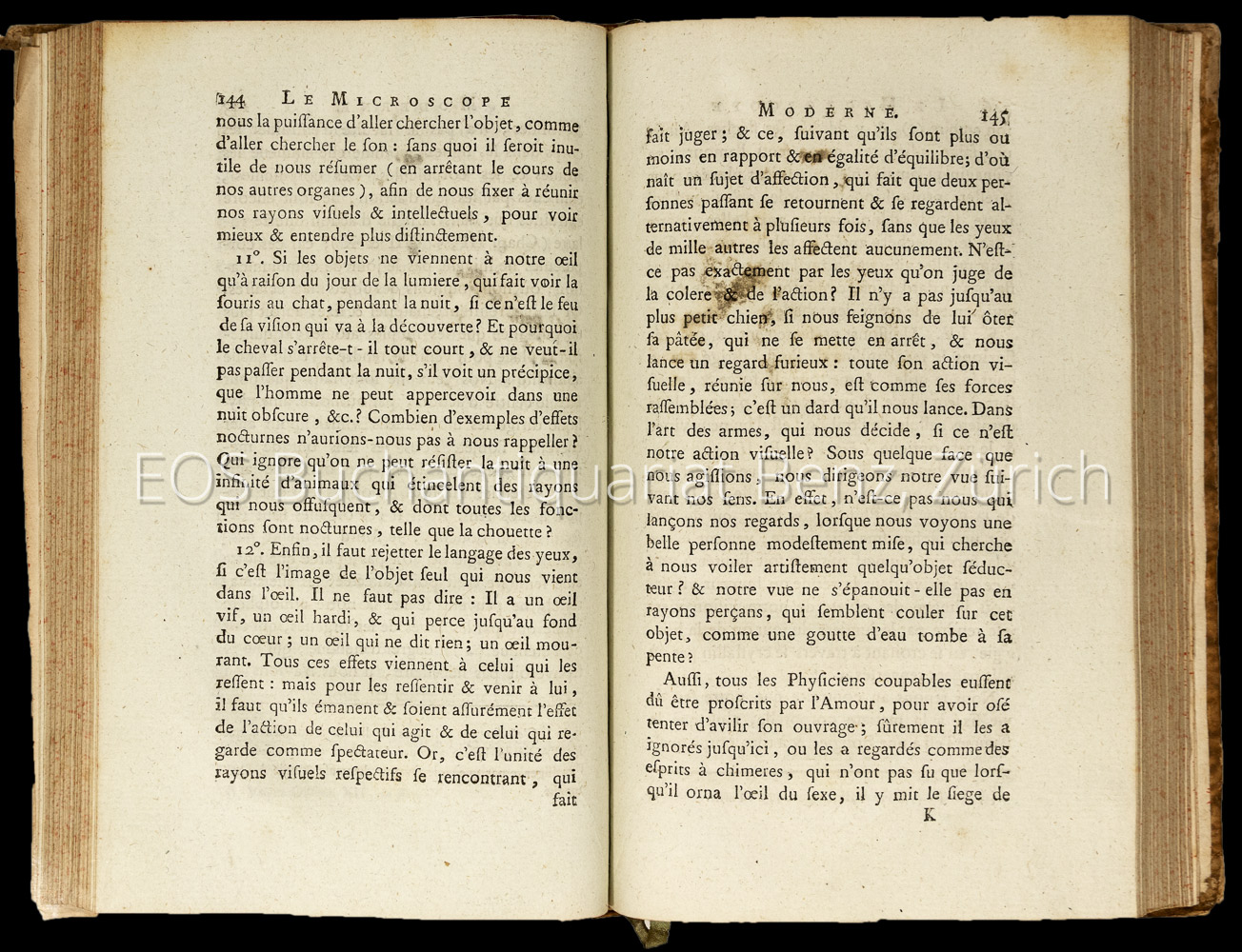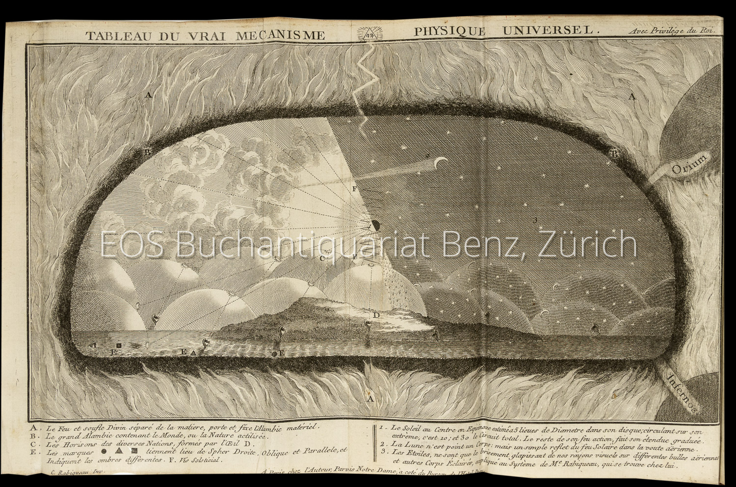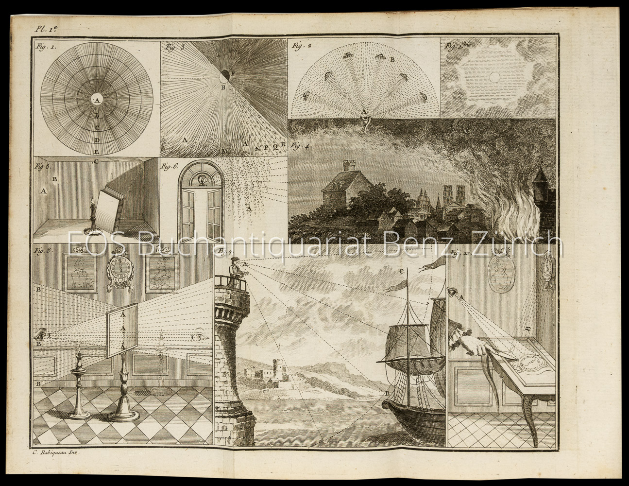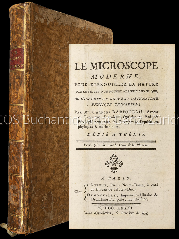 Rabiqueau, Charles:  Le Microscope moderne, pour débrouiller la nature par le filtre d’un nouvel alambic chymique, qu l’on voit un nouveau méchanisme physique universel. Paris, Demonville, 1781. 8°. (4) Bl., 364 S. Mit 4 mehrfach gef. Kupferstichen und einer gestochenen Karte. Pappband der Zeit mit Kleisterpapierbezug.