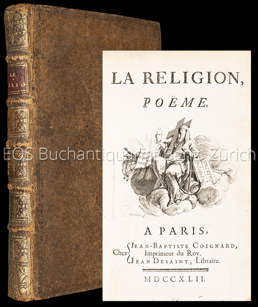 Racine, Louis: La religion. Paris, Jean-Baptiste Coignard 1742. 1.: XVI, 206, 2.: 55 S. Goldverzierter Kalbsrederband.