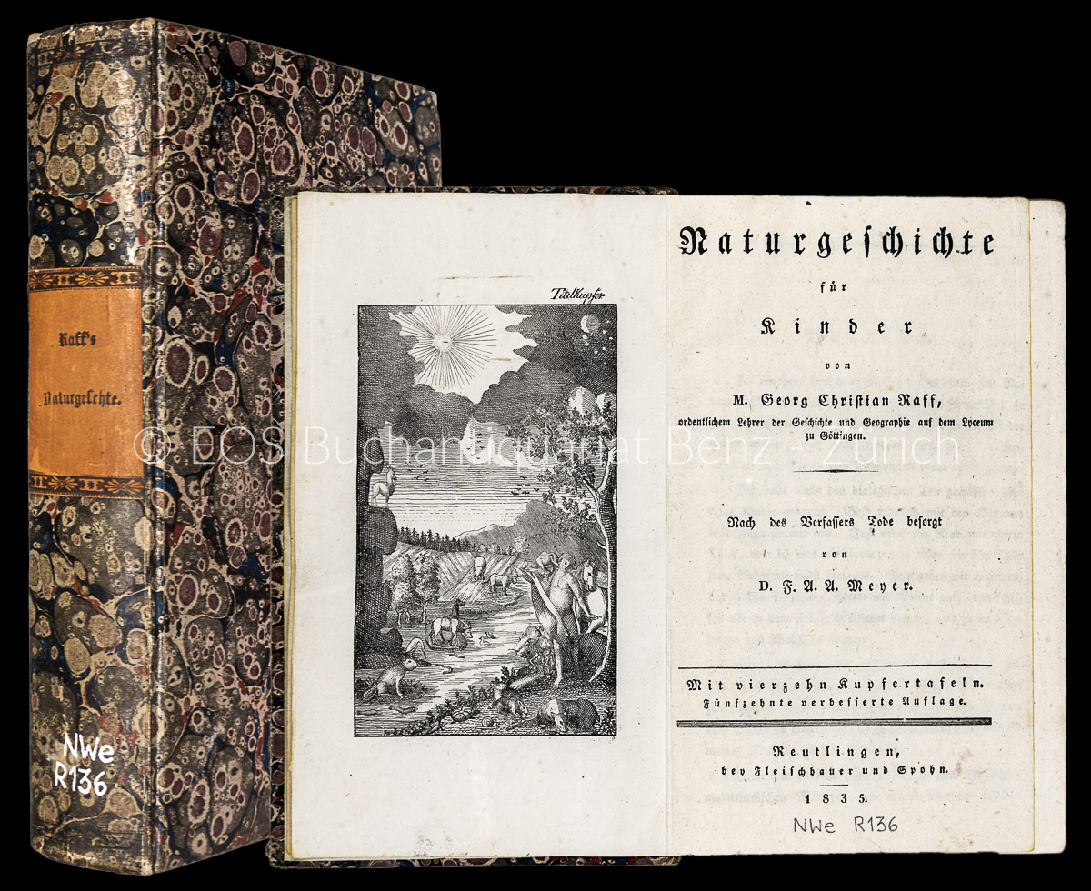 Raff, Georg Christian: Naturgeschichte für Kinder. Nach des Verfassers Tode besorgt von D. F. A. A. Meyer. Reutlingen, Fleischbauer, 1835. 15. Aufl. 8°. XII, 600 S. Mit 1 gest. Frontispiz und 14 Kupfertafeln. Pappband aus der Zeit mit Mamorpapierbezug und Rückenschild.