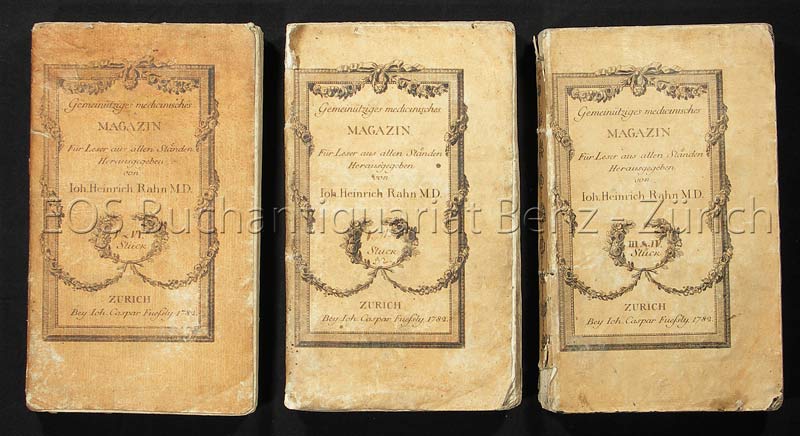 Rahn, Joh. Heinrich (Hrsg.): Gezette de Santé oder gemeinnütziges medicinisches Magazin für Leser aus allen Ständen und zum Besten einer Privat-Anstalt für arme Kranke. Zürich, Joh. Caspar Füessly, 1882. 3 Bde. Gr.-8°. XIII, 263 S.; S. 265-520; S. 521-712, S. 619-626. Broschur der Zeit (stark berieben und bestossen, fleckig).