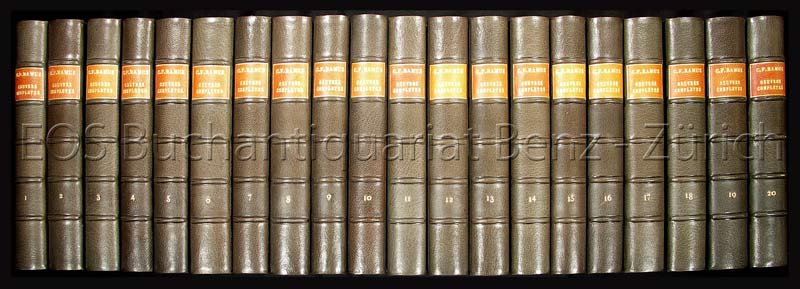 No. V von L römisch num. Exemplaren auf „Hollande van Gelder“, aus einer Auflage von 1565, im Kolophon von Ramuz signiert. Erste Gesamtausgabe der Werke von Charles-Ferdinand Ramuz (1878-1947), der grösste Dichter der Romandie im 20. Jahrhundert und wohl bedeutendste Vertreter der französischsprachigen Schweizerliteratur. Auf die Initiative seines Verlegers Henri-Louis Mermod nahm er sich sämtliche Werke noch einmal vor, las sie durch und überarbeitete sie zum Teil für diese Ausgabe. Die 20 Bände bilden eine Einheit, die nach Ramuz‘ Tod von Mermod auf 23 Bände ergänzt wurde (1954). – Sehr schönes Exemplar. (Sprache: Französisch / Français / French)