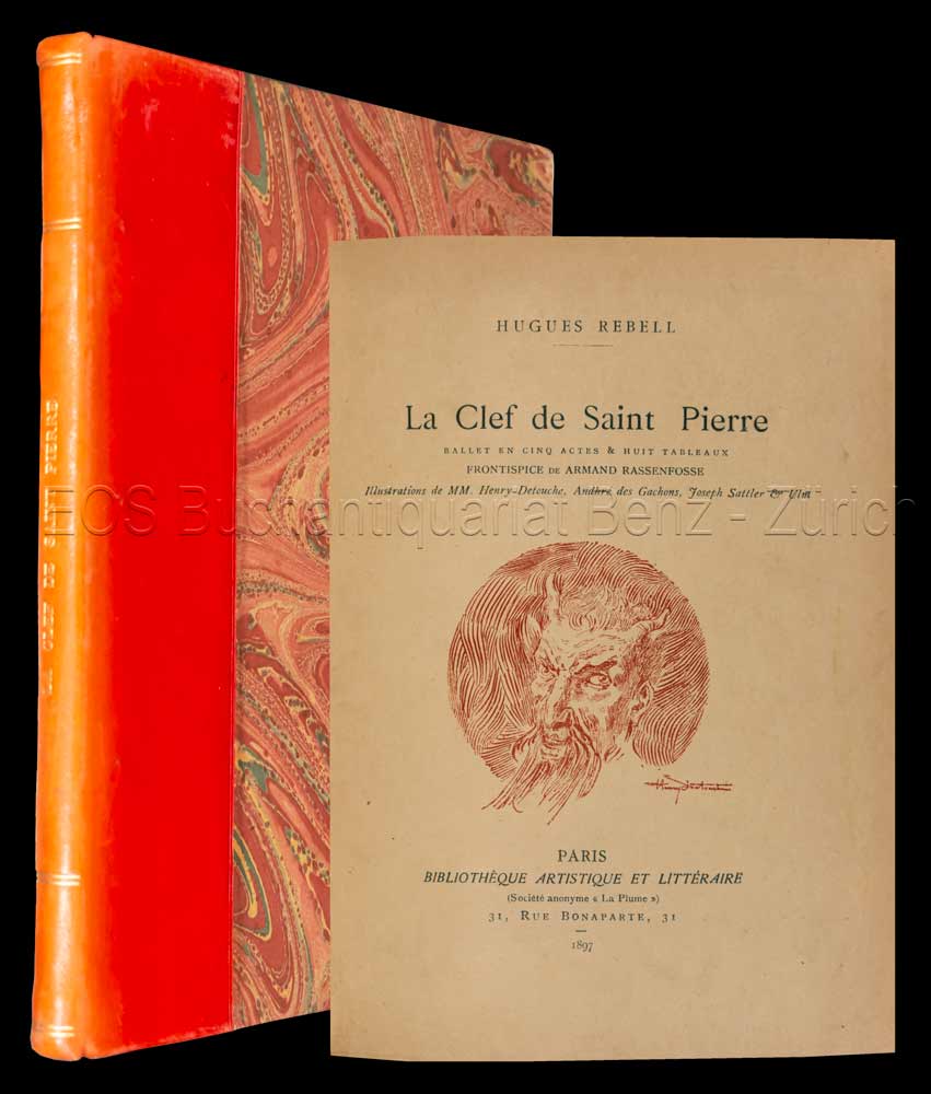Rebell, Hugues: La Clef de Saint Pierre. Ballet en cinq actes & huit tableaux. Paris, Bibliothèque artistique et littéraire 1897. Gr.-8°. 78 S., (1) Bl. Mit zahlr. Illustrationen, zum Teil ganzseitig und koloriert von Henry Detouche, Andhré des Gachons, Joseph Sattler und Ulm. Halblederband der Zeit mit verg. Rückentitel.