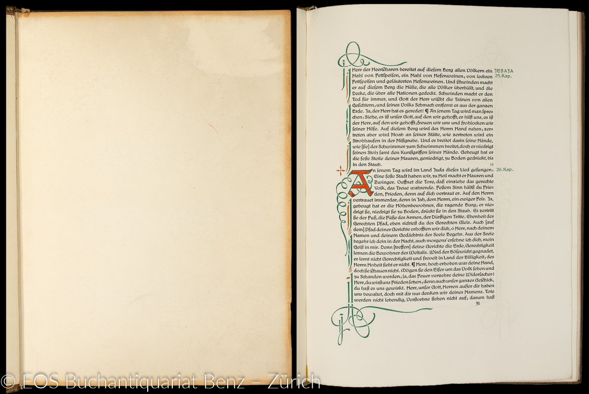 Reden, Berichte und Weissagungen Jesajas. Aus dem Urstext übertragen durch Lazarus Goldschmidt. Berlin, Max Perl, Buch- und Kunstantiquariat, 1918. Folio. 86 S., (1) Bl. Lederband der Zeit mit schlichter Vergoldung.