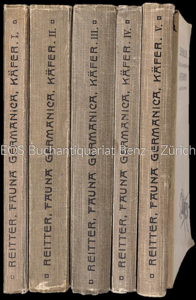 Vorhanden sind neben den fünf Hauptbänden die zwei Ergänzungsbände: Horion, Sigmund Schenkling „Erklärung der wissenschaftlichen Käfernamen aus Reitter’s Fauna Germanica“. – Mit Gebrauchsspuren. (Sprache: Deutsch / German)